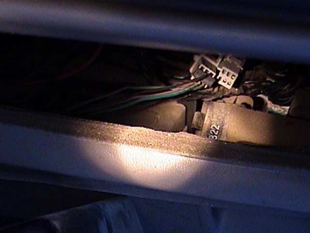 | This is the slot in the dashboard where the glovebox came out. In the cavity, you can see a multi-wire harness, and the two halves of the connector. This has already been disconnected. The colorful wires are about eight or ten inches long, and connect to the box to the left of the box labeled "822". |